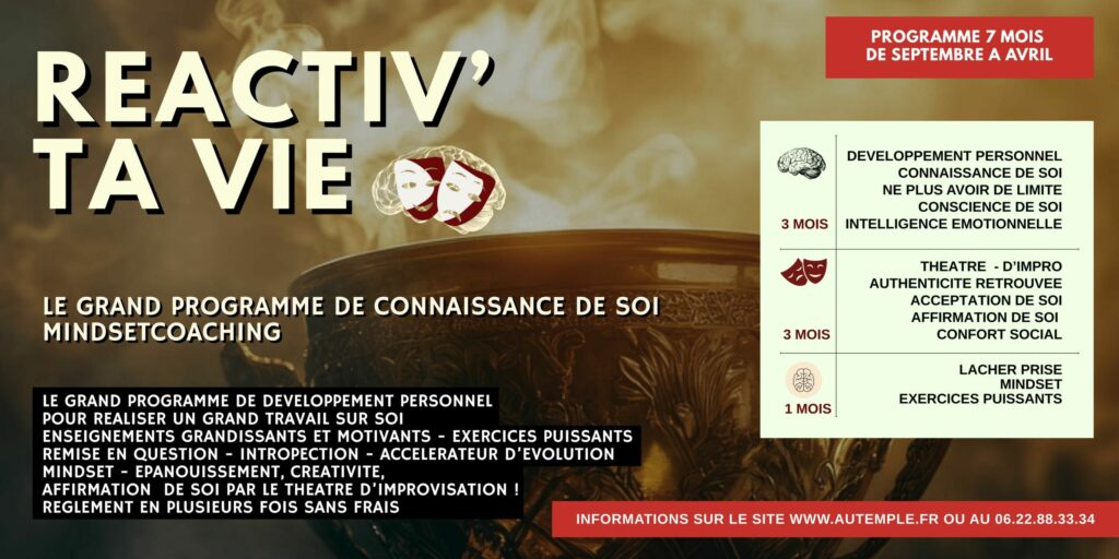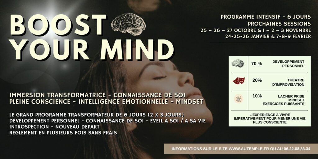 BOOST YOUR MIND – UN PROGRAMME MAGISTRAL DE 6 JOURS – DEVELOPPEMENT PERSONNEL, MINDSET THEATRE D’IMPROVISATION – SEANCE CHAMANE Un avant et un après garanti, le programme qui T’OUVRE LES PORTES A L’ABONDANCE, LA CONNAISSANCE DE SOI, – REBOOSTER SES PROJETS DE VIE, UNE INCROYABLE AVENTURE HUMAINE, UNE IMMERSION GRANDISSANTE – UN GRAND BOOST A TA VIE ! – Une évolution rapde dans tous les domaines de ta vie, es tu prêt à te choisir ? à passer à l’action ? à surpasser tes peurs ? A propulser tes plus grands projets ?