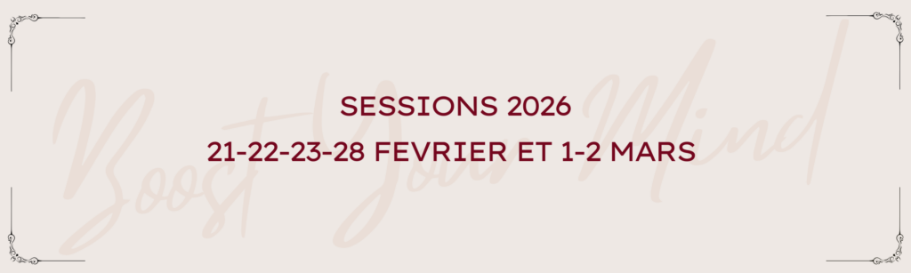 BOOST YOUR MIND SE COMPOSE EN 3 PARTIES : – D’OU JE VIENS / – OU JE SUIS / – OU JE VAIS Cette grande expérience te permet aussi de changer de posture en t’apprenant l’intelligence émotionnelle, « la grandeur d’esprit », compréhension de soi et de l’autre et clairvoyance sur votre vie. Il y a CLAIREMENT UN AVANT / UN APRES Aussi, Boost Your Mind est une rare formation où le développement personnel est mis en pratique pour un changement immédiat – UN SAUT QUANTIQUE. Ces exercices sont connus pour leur puissance et leur effet transformateur. L’objectif : des prises de conscience réelles et des changements durables. Bien souvent mes clients viennent après avoir essayer de nombreuses méthodes car ils savent que Boost your mind apporte LE CHANGEMENT et le dépassement des blocages, peurs, croyances ancrées depuis trop longtemps. Ce programme est une grande et belle expérience humaine qui vise l’amour pour soi. Vous risquez de créer de beaux contacts.  Un programme classé « d’excellence »
