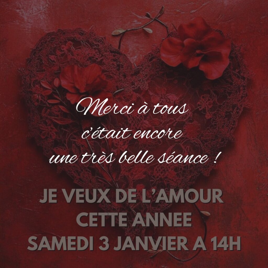 Lors de cette séance sera expliqué comment ne plus vous empecher à vous laissez aimer et aimez en retour. Ouvrez votre cœur et votre esprit, et laissez l’amour entrer dans votre vie. Vous ne savez jamais ce que l’amour peut vous apporter. Bien souvent c’est un changement de vie !