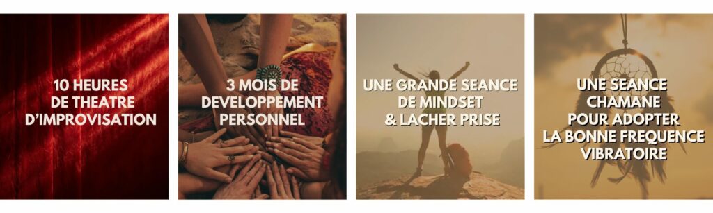 Lors de cette partie, vous bénéficierez d’une séance d’initiation à la « l’auto-reprogrammation », mais aussi un nettoyage energetique au tambour chamane, ainsi qu’un grand exercice de Mindset pour cloturer la partie développement personnel. Aussi vous disposerez d’une séance complète d’initiation à la méditation pleine conscience & relaxation guidée, mais aussi ainsi qu’un retour au théâtre d’improvisation, des exercices de Lâcher prise pour vous poussez encore plus loin ! Cette dernière partie est grandement appréciée !!