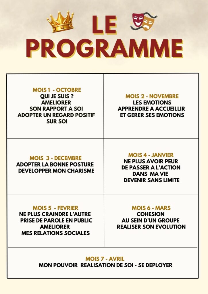 Au programme : Chaque mois, en plus de l'improvisation et du jeu, nous plongeons au cœur d'un thème puissant pour une progression concrète de votre confiance en vous et de votre épanouissement personnel.